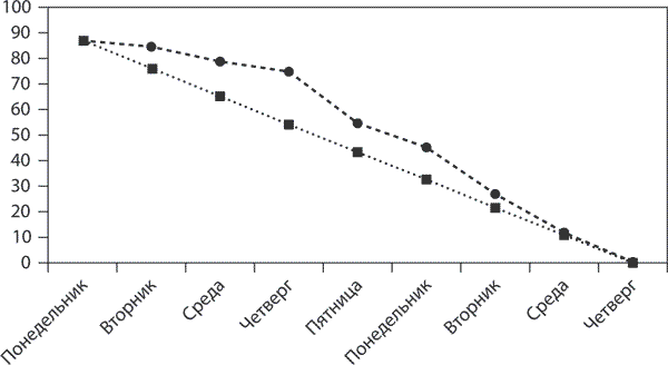 Упрощенно, если линия, отображающая прогресс работы, окажется выше этой диагонали – значит, налицо отставание от графика, а если ниже – команда выполняет работу раньше срока.