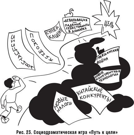 Это длинное отступление от темы фасилитации как таковой призвано показать, что игра способна вызывать настолько подлинные эмоции, что люди забывают про ее условность. Поэтому, вопреки моим многолетним убеждениям, сегодня я признаю, что игры могут быть действенным инструментом глубинной фасилитации. Расскажу об одной такой игре, которую разработал Павел Безручко, мой друг и партнер по бизнесу. Она называется «Путь к цели» и использует методы социодрамы. Это даже не стандартная игра, а скорее метафорическая игровая «рамка», которая может наполняться разными персонажами и сюжетами и решать различные задачи.