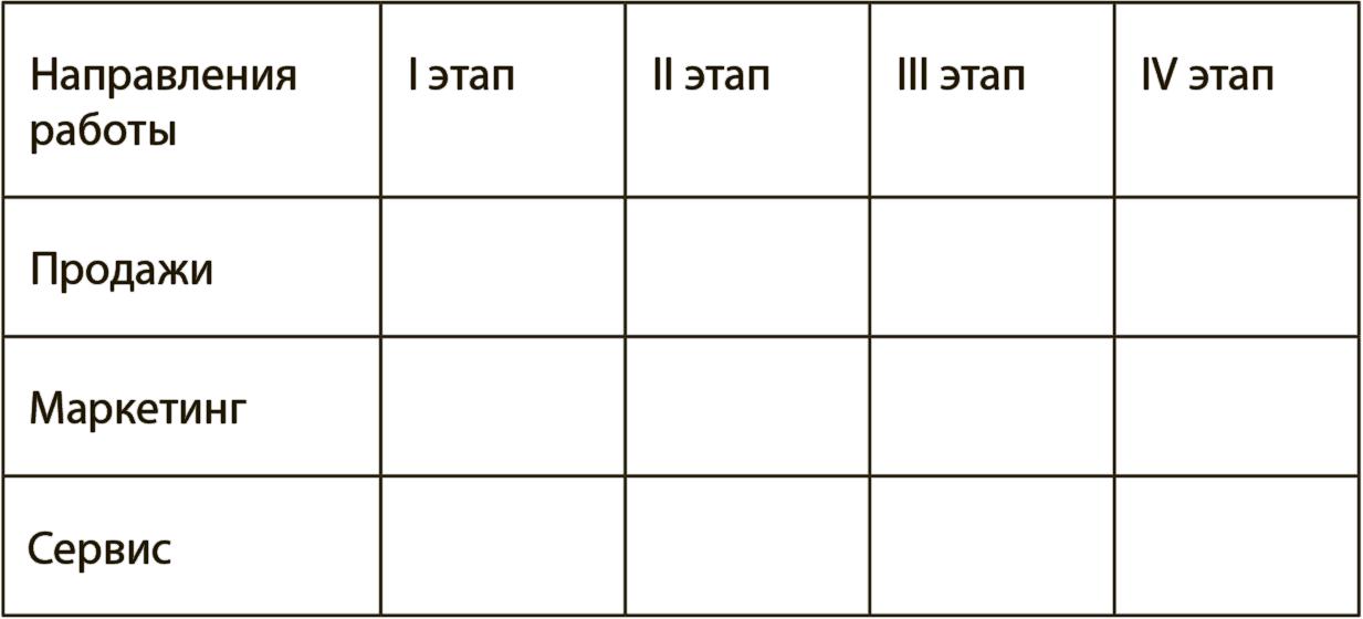Итак, участники фиксируют каждый на своих стикерах те или иные проектные задачи в рамках одного из трех направлений рыночного продвижения и наклеивают заполненные стикеры на соответствующие отрезки временной оси (I–IV этапы). На работу со стикерами участникам дается 15 минут.