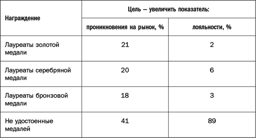 Как показал недавно проведенный анализ 880 заявок на участие в конкурсе IPA[23] за эффективную рекламу, победители значительно чаще ставили перед собой цель увеличить проникновение на рынок. Каждый номинант указал первоочередную задачу своего бизнеса: для 178 участников целью было «удержание клиентов / повышение лояльности», а 79 из них занимались «привлечением новых клиентов / проникновением на рынок». И вот как распределились награды относительно заявленных целей (табл. 2.5).