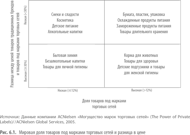 На рис. 6.1 показана мировая доля товаров под марками торговых сетей и разница между ценами товаров под марками торговых сетей и ценами товаров традиционных брендов для 14 видов товаров{102}. Как мы видим, в некоторых категориях, где разница в цене большая – бытовая химия, безалкогольные напитки, товары для личной гигиены, доля товаров под марками торговых сетей низкая. Но в некоторых категориях товары под марками торговых сетей могут занимать большую долю рынка, но при этом разница в цене будет невелика – замороженные и охлажденные продукты питания, продукты питания с длительным сроком хранения, бумага, пластик, пленка для хранения продуктов. Ясно, что в действительности все намного сложнее и тоньше, и нельзя рекомендовать розничным сетям просто снижать цену на товары под собственными марками, чтобы добиться увеличения доли этих товаров.