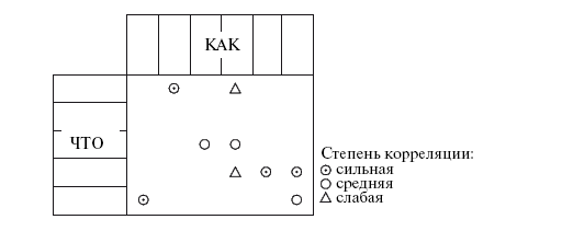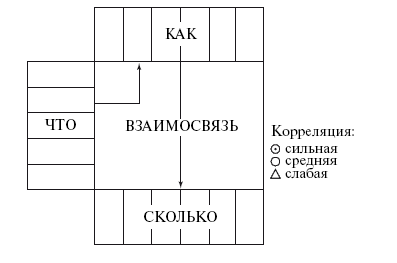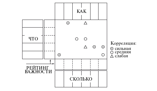 Графа «матрица взаимосвязи» отражает корреляцию между требованиями потребителя и техническими требованиями. Степень корреляции отражается соответствующими значками (рис. 5.26).