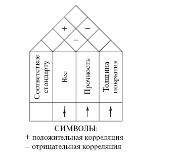 Решая вопрос о целесообразности изменений, нужно обратить внимание и на крышку «домика» – взаимную корреляцию технических требований. Да, требование, например, № 5 неважно для потребителя и технически сложно реализуемо. Но оно коррелировано, например, с требованием № 14, которое для потребителя очень важно. Стало быть, придется совершенствовать и его. И все хорошо, если направленность изменений одинакова, а корреляция – положительная. А вот если она отрицательная – возникает ситуация, которую специалисты называют техническим противоречием. Его разрешение потребует значительных усилий со стороны проектировщиков – нужно увеличивать сроки и бюджет проекта. Методы разрешения таких противоречий рассмотрены в главе 4.