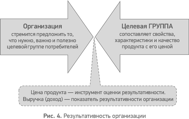 Реализация интересов владельцев, менеджеров и персонала организации возможна лишь с получением дохода. Она будет настолько полной, насколько полно охваченной окажется целевая группа потребителей (т. е. речь идет о соотношении числа ее представителей, купивших продукт и с его помощью реализовавших свои интересы, и тех, кто этого не сделал). Следовательно, количество произведенного и затем проданного продукта, а также размер выручки (дохода) – это в первую очередь показатели результативности организации и только потом источник реализации интересов персонала, менеджеров и владельцев.