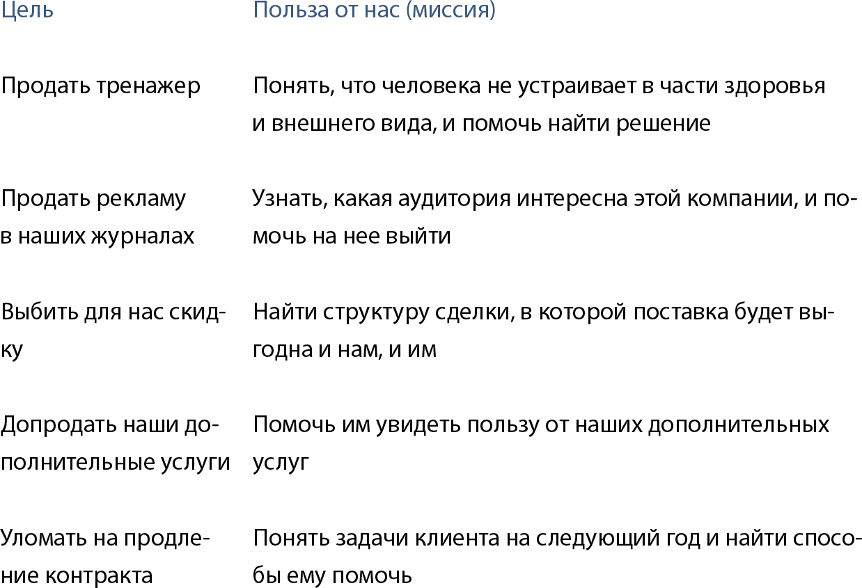 Если классическая цель встречи — это то, чего мы хотим, то миссия — это то, почему другие могут хотеть с нами встретиться. Если сформулировать ответ на этот вопрос перед встречей, можно эффективно управлять своим поведением на самих переговорах. Сравните: