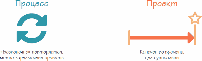 • Процесс выполняется многократно – по стандартному алгоритму. А каждый проект более-менее уникален и конечен во времени.