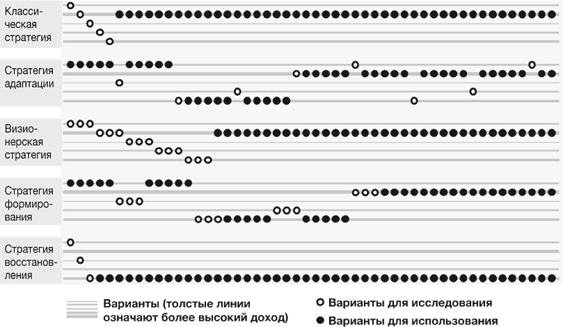 Стратегии, тестируемые в этих условиях, можно также смоделировать как варианты, которые выбирает вымышленный игрок (или стратег), с учетом информации о доходности, полученной им в результате предыдущих инвестиций. Алгоритмы, на основе которых делается такой выбор, могут меняться в зависимости от того, сколько информации было собрано в результате предыдущих инвестиций, какое значение придается этой информации, сколько усилий и времени тратится на изучение новых вариантов, как корректируется представление о доходности инвестиций и насколько быстро выбирается стратегия для предпочтительного варианта инвестиций. Таким способом можно смоделировать варианты поведения при поиске, адаптации, формировании и сохранении ресурсов, на основе которых строятся пять подходов палитры стратегий.