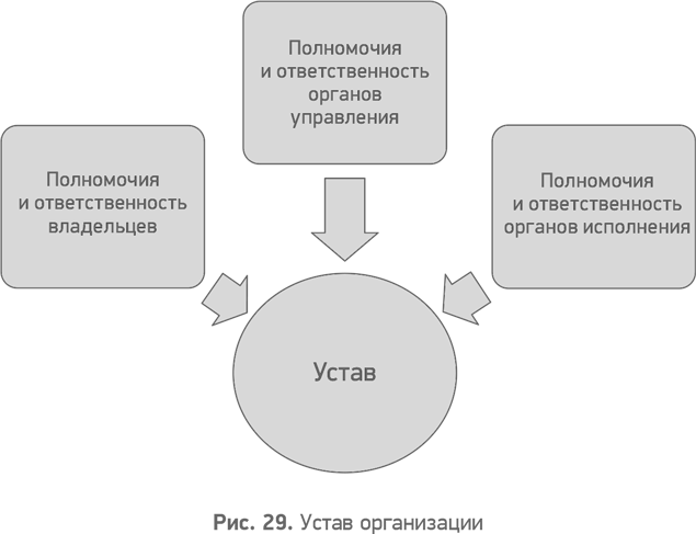В уставе каждой организации есть перечни вопросов, относящихся к исключительной компетенции того или иного органа управления (от высшего уровня до низшего) или исполнения. Иными словами, устав описывает полномочия и ответственность, которые владельцы организации оставляют за собой, а также то, что они, как высший орган, делегируют другим органам управления и исполнения (рис. 29).