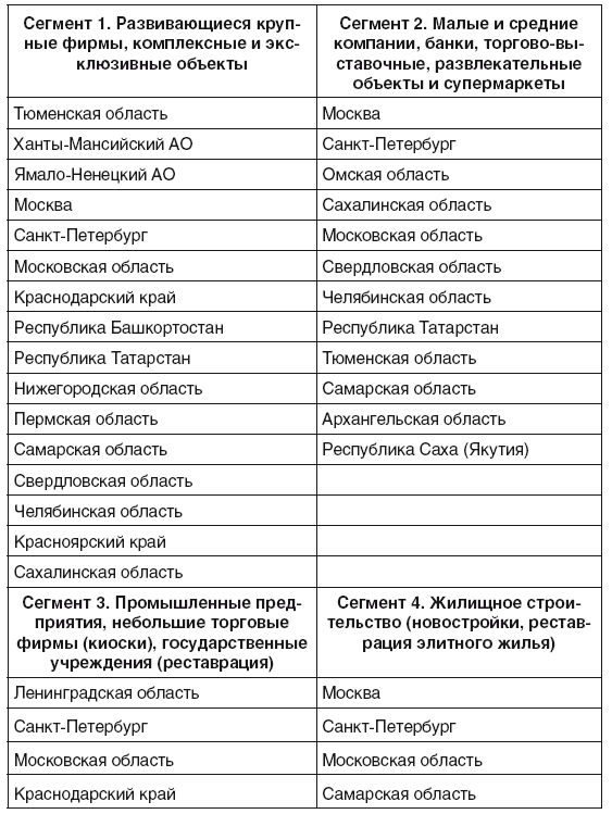 Для каждой группы потребителей были определены перспективные регионы (табл. 4.16). При этом учитывались следующие критерии: