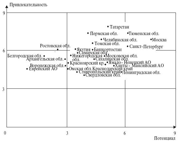 В тактическом плане ведущие регионы (Москва, Санкт-Петербург, Тюменская область) уже сегодня готовы для развития бизнеса. Однако в стратегическом плане для нас значительный интерес представляют районы с невысоким пока стратегическим потенциалом, но обладающие возможностями более быстрого роста. Итог: целевые сегменты представлены на рисунке 4.25 в матрице «Привлекательность—Потенциал».