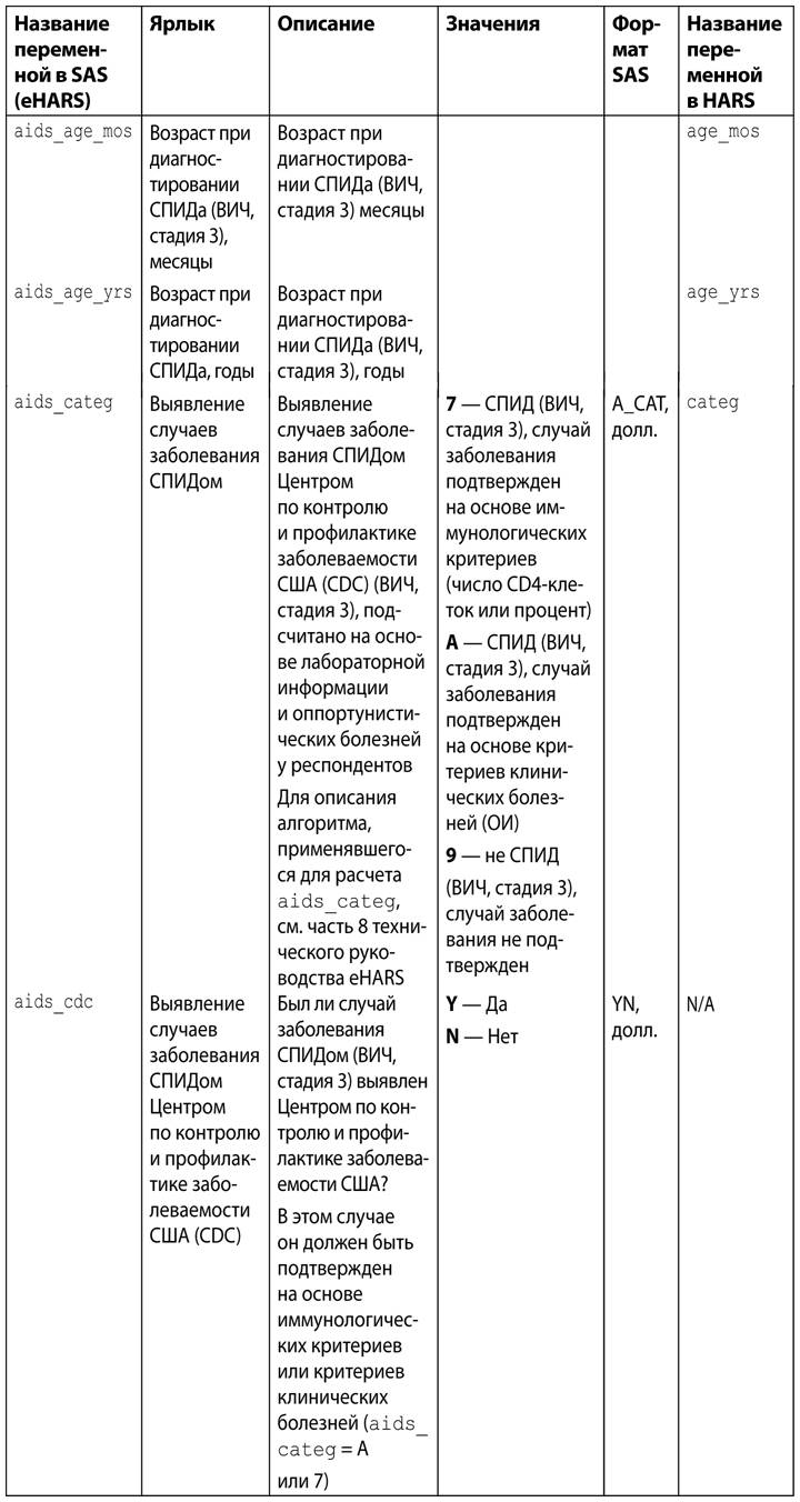 Благодаря качественному словарю становится понятно, как определяются данные, в каком формате и с какими допустимыми значениями. В данном случае также очевидно, как эти данные используются программным обеспечением. Приведены несколько строк из eHARS[44] (Enhanced HIV/AIDS Reporting System — Улучшенная система сбора информации о ВИЧ/СПИДе) в Калифорнии. (SAS — статистический набор приложений, активно применяющийся в области медицины.)