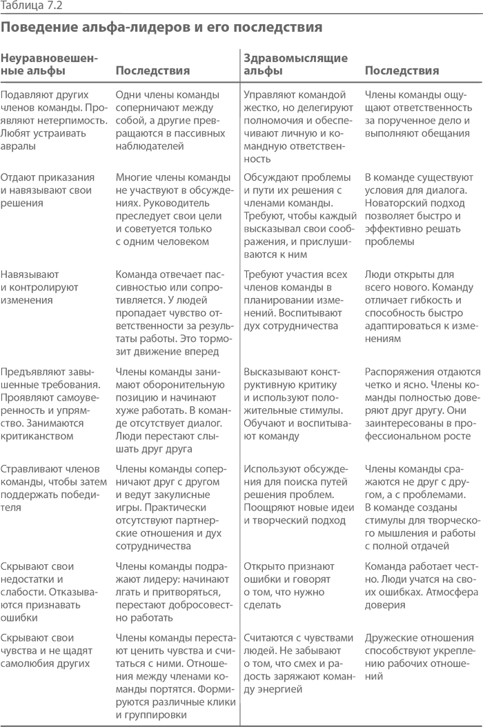 В таблице 7.2 показано, что происходит, если руководство компании способно обеспечить нормальное взаимодействие в коллективе. В первом и третьем столбцах представлены, соответственно, модели поведения неуравновешенных альфа-лидеров и здорового взаимодействия и диалога, а во втором и четвертом – их последствия. Анализируя таблицу, постарайтесь ответить на следующие вопросы.