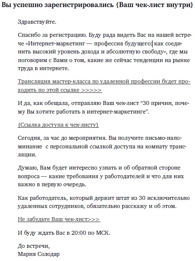 Параллельно новый подписчик получает автозвонок с приветствием от меня и письмо благодарности за регистрацию с доступом к чек-листу и ссылкой на трансляцию.