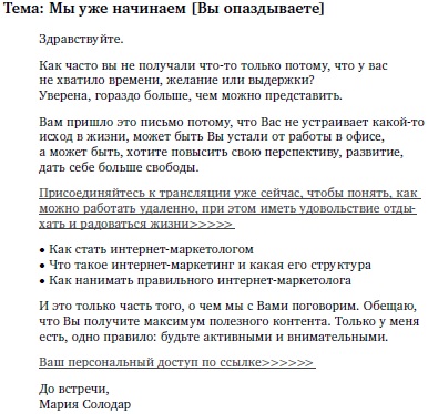 Еще одна вариация – если подписчик вебинар не посещал. В таком случае выдвигается гипотеза, что мотивации посетить мероприятие и инвестировать свое время пока мало, поэтому человеку отправляются письма прогрева с полезными материалами, а затем – повторное приглашение на вебинар.