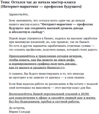 Также ему приходят два письма-напоминания со ссылкой на комнату вебинара в этот же день: за час и во время начала трансляции.