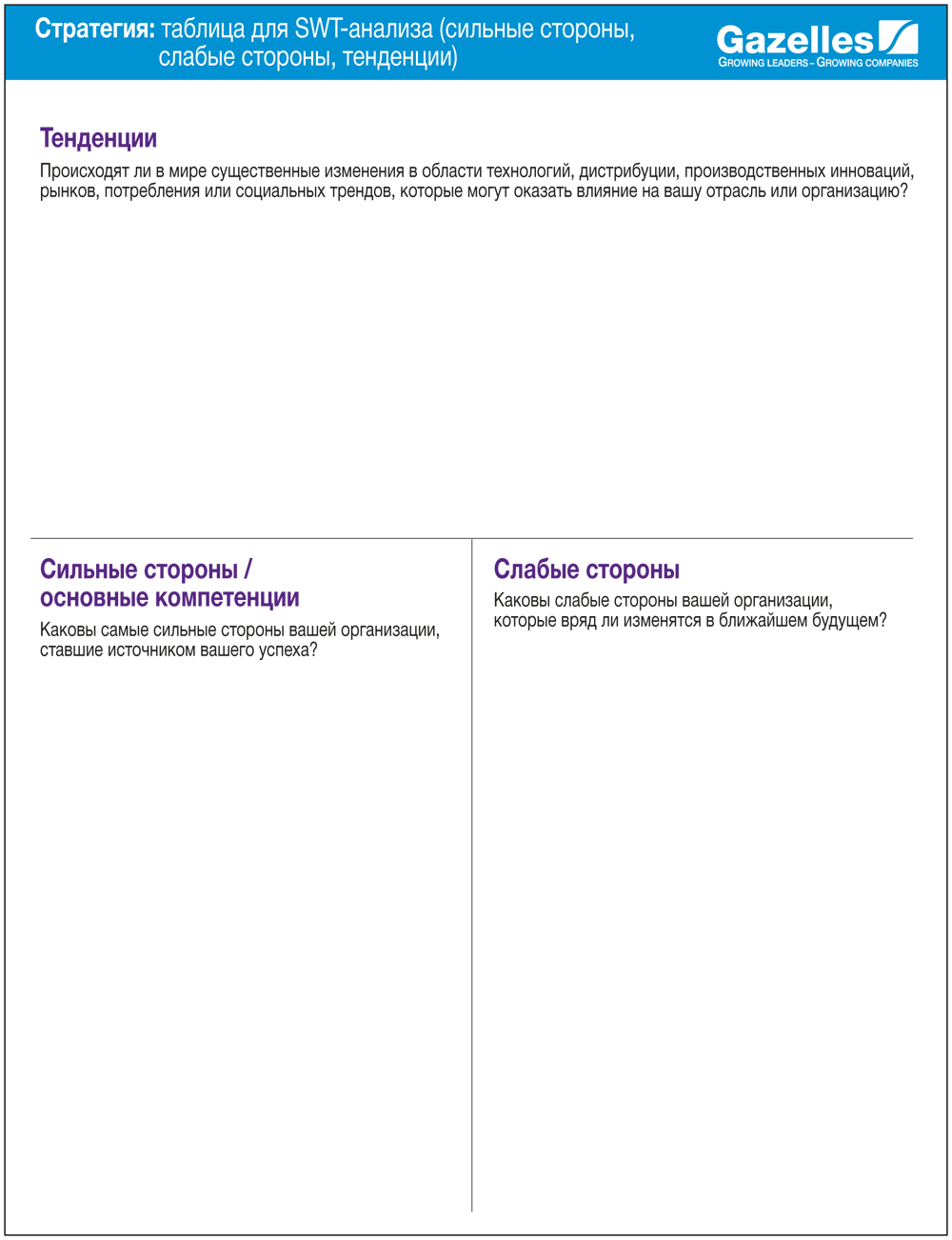 Процедура SWOT-анализа позволяет лидерам глубже рассмотреть трудности и задачи, с которыми сталкиваются их компании и отрасли в целом. SWT-анализ фокусируется на более общих внешних тенденциях, выходящих за пределы отрасли или географического расположения компании. Этот мощный инструмент позволит вовремя замечать новые возможности и предотвратит «близорукость» в управлении.