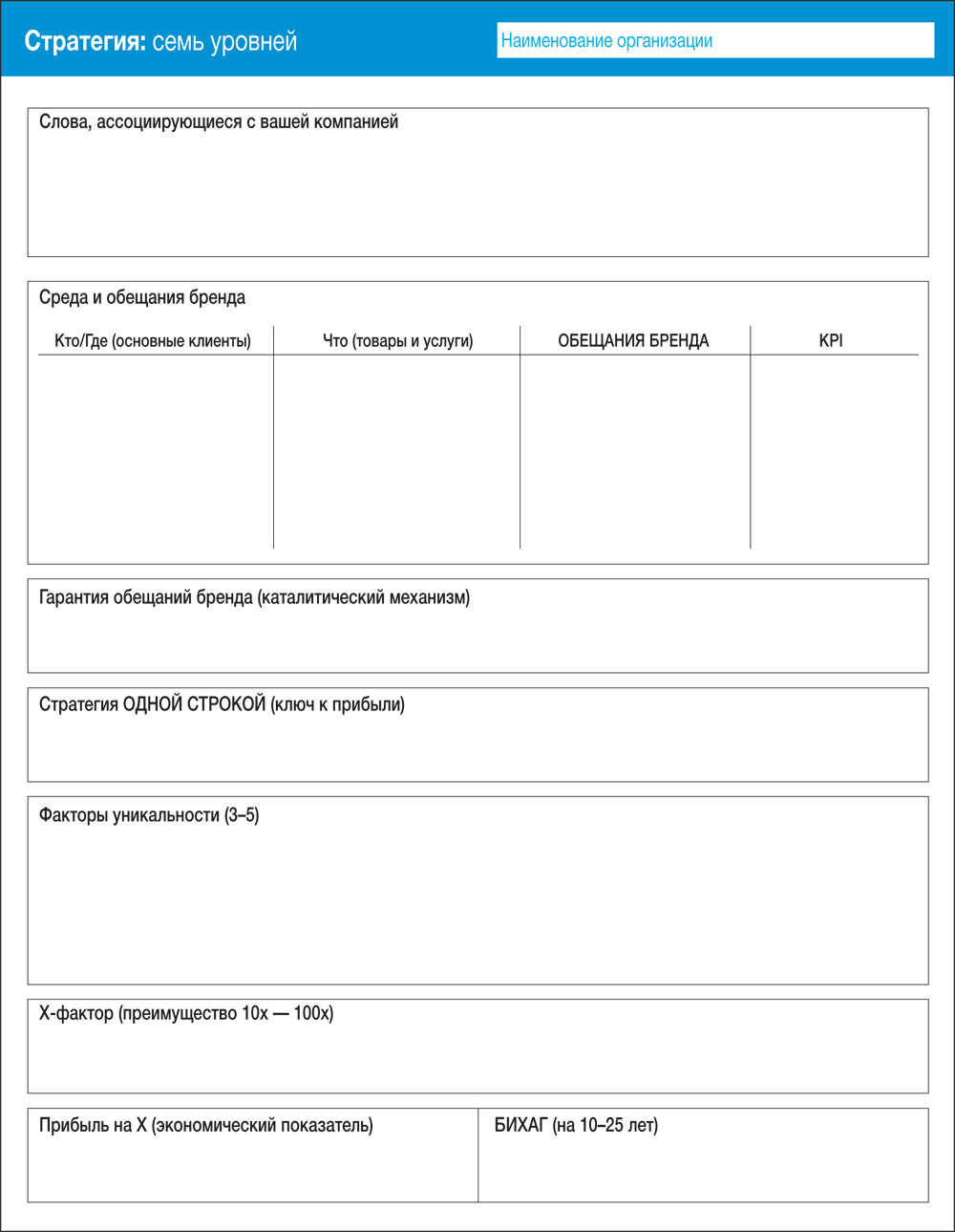 Семь уровней стратегии. Этот инструмент помогает выделить семь компонентов (уровней) эффективной и одновременно простой стратегии. С его помощью вы сумеете придать компании индивидуальность и занять лидирующие позиции в своей отрасли.