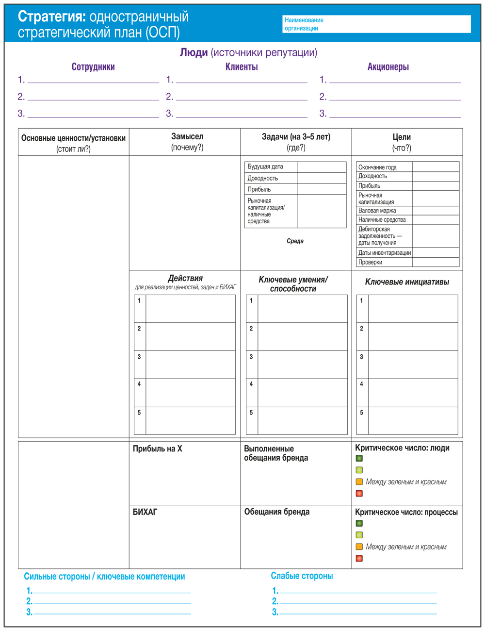 Одностраничный стратегический план (ОСП). Если хотите, чтобы сотрудники действовали слаженно, без плана не обойтись. ОСП – это наш самый известный и широко использующийся инструмент, разработанный для обеспечения координации, подотчетности и концентрации.