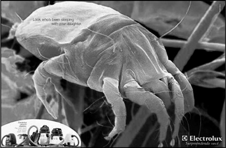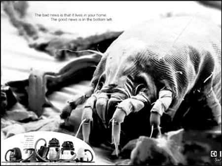 Заголовок: «Плохая новость состоит в том, что это существо живет в вашем доме. Хорошая новость располагается в левом нижнем углу объявления» (рис. 36). Рекламируемые пылесосы удаляют не только привычную пыль, но и этих жутких, отвратительных клещей.