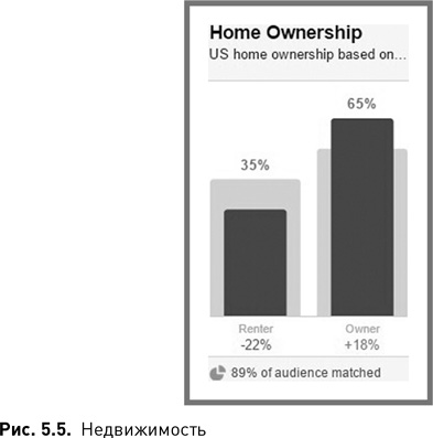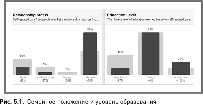 1. Клиенты компании состоят в браке и имеют высшее образование, причем многие из них обладают степенью магистра. Значения этих показателей у них выше, чем у среднего пользователя Facebook (рис. 5.1).