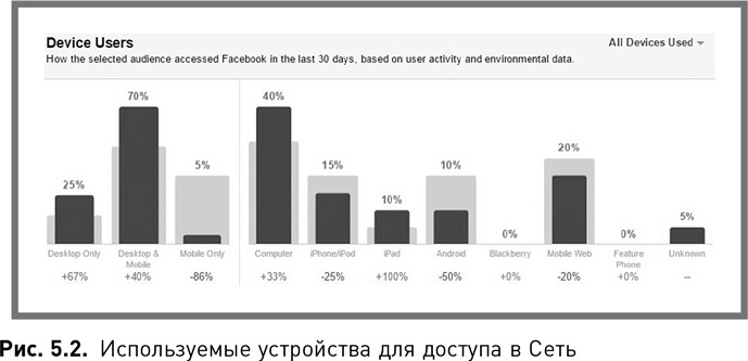 2. Большинство из них пользуется для выхода в сеть и настольным компьютером, и мобильным телефоном, однако четверть использует только компьютер. Это значительно больше, чем в среднем по Facebook и может считаться хорошим условием для организаций, занимающихся маркетингом в сети, поскольку идеальные перспективные клиенты этой компании значительно чаще будут изучать приходящие к ним сообщения на больших экранах. Лишь 5 % аудитории пользуется для выхода в Facebook исключительно мобильными телефонами, это на 86 % меньше в сравнении со средним пользователем Facebook (рис. 5.2).
