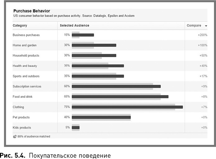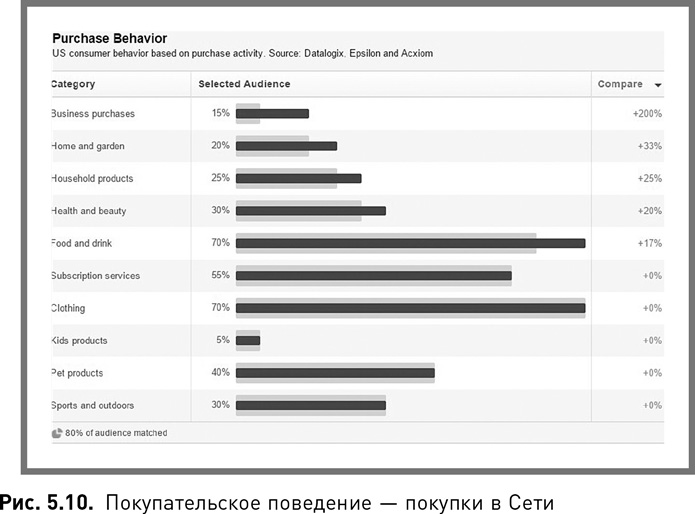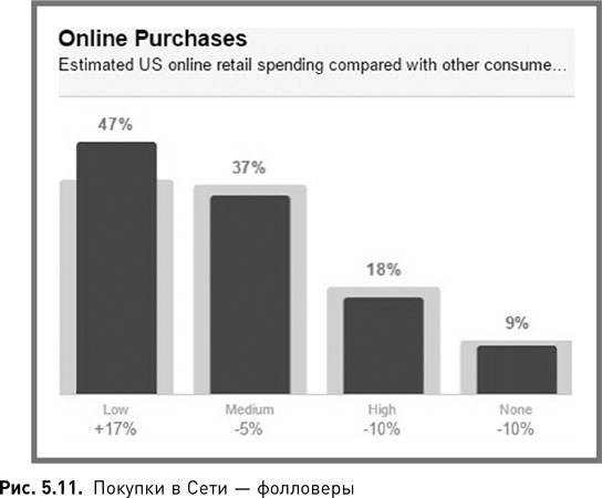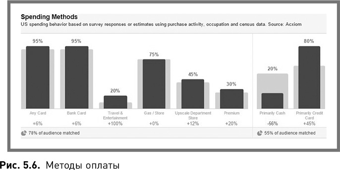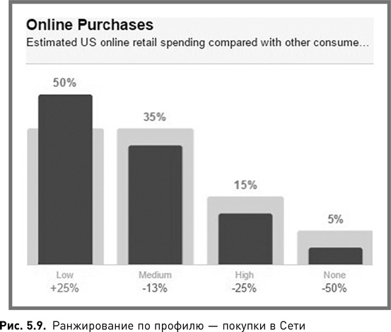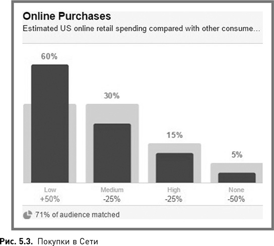 3. Они тратят меньше денег в Сети, чем средний пользователь Facebook (рис. 5.3). Лишь 45 % из них тратят на онлайн-шопинг столько же или больше, чем средний пользователь. Можно предположить, что в данном случае компании стоит игнорировать тех, кто не тратит деньги в онлайне, однако статистика говорит об ошибочности подобных выводов.