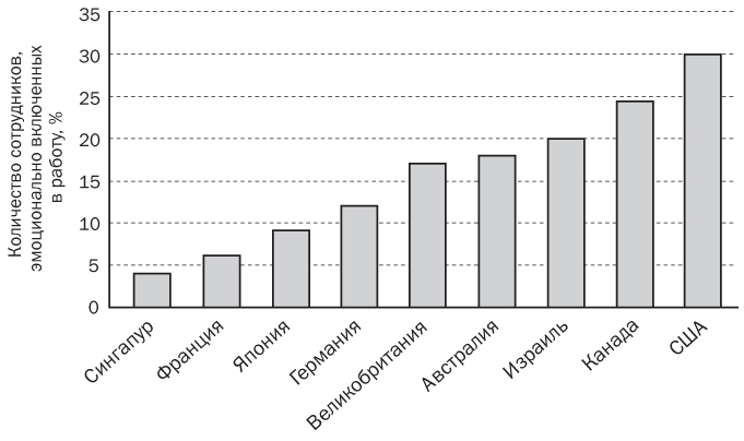 Если люди разобщены, работа их не увлекает. Недостаток вовлеченности в общее дело может привести к нежелательным последствиям для организации. Тридцатилетнее международное исследование феномена эмоциональной включенности, законченное институтом Гэллапа в 2004 году, показало, что большинство людей не испытывают привязанности к работе[40]. Вот слова Джеральда Вуда, исполнительного директора института Гэллапа в Германии: «Приверженность к работе непосредственно влияет на продуктивность, удовлетворенность потребителей, количество прогулов и уровень текучести кадров – ключевые факторы экономики, связанные с умонастроением людей»[41]. Отсутствие интереса людей к работе снижает рентабельность компаний. Исследование института Гэллапа свидетельствует об отсутствии в деловой сфере эмоциональных связей ПБ-типа. Сведения о вовлеченности в работу, полученные в разных странах, представлены на диаграмме (рис. 3.2).