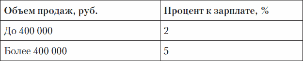 Мотивационный эффект будет выше, если процент будет прямо пропорционален объему продаж. Поэтому я рекомендую не устанавливать фиксированный процент, а ранжировать его по плану продаж. Пример приведен в табл. 8.3.