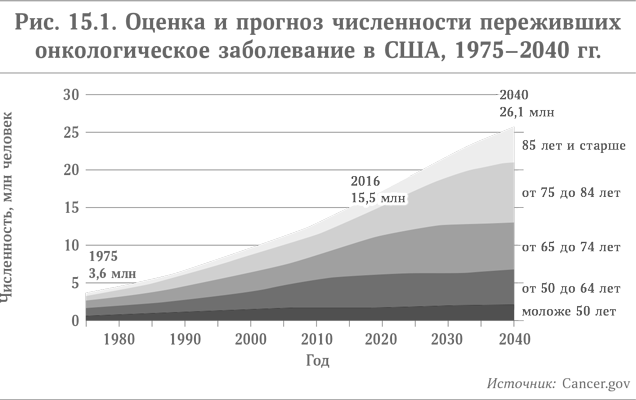 В 1970-х гг. шансы на выздоровление ракового больного были ниже 50 %. Сейчас они значительно выше: по данным Американского онкологического общества, за пятилетний период доля выживших взрослых больных составляет 67 %. Но при этом прогнозируется, что к 2050 г. число людей с онкологическими диагнозами почти удвоится в связи со старением населения (Edwards et al., 2002) и диагностикой на ранних стадиях.
