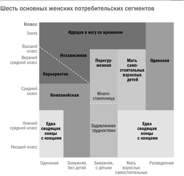 Конечно, все люди разные, но в своем исследовании мы старались выявлять закономерности. Оказалось, что наши респондентки принадлежат к шести основным типам. Мы их классифицировали главным образом по таким факторам, как доход, возраст, этап жизни. Мы назвали эти типы так: «идущая в ногу со временем», «перегруженная», «компанейская», «одинокая», «мать взрослых самостоятельных детей» и «едва сводящая концы с концами». Редко кто пребывает в одной категории всю жизнь. Например, «идущие в ногу со временем» после многих лет замужества могут перейти и в категорию «перегруженных» (см. врезку «Шесть основных женских потребительских сегментов»).