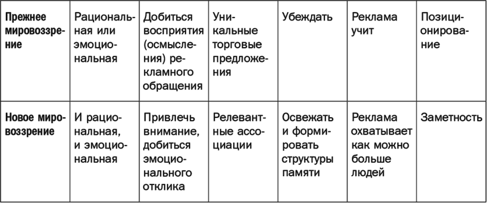 Так что же происходит? Кто прав? Какие эмпирические данные свидетельствуют в пользу того, что реклама стимулирует продажи? Как она работает на самом деле? Как маркетологам ее использовать? И как замерять эффект от рекламных усилий? Эта глава отвечает на все вопросы и представляет модель рекламы бренда, которая сообразуется со всем известным о покупательском поведении в отношении брендов и о свойствах памяти. Изменения в представлениях о рекламе обобщены в табл. 9.1.