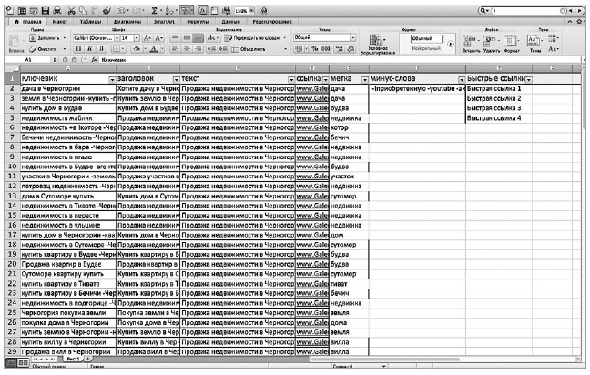 Если ты всё сделал правильно, то у тебя должно было получиться следующее: столбец ключевиков, напротив него столбец с заголовками и столбец с текстами, потом столбец для ссылок и столбец с метками. Каждому ключевику соответствует свой заголовок, текст, ссылка и метка. Отдельно такая же таблица получится для тёплых ключевиков. Кроме того, есть общий список минус-слов, минус-слова только для горячего списка, быстрые ссылки. Теперь нужно весь этот хаос привести в нормальный вид и загрузить кампанию в интерфейс Яндекса.
