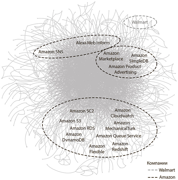 Рис. 3.1. У Amazon куда больше комплексов API, чем у Walmart. Это единые платежи, онлайн?торговля, облачные сервисы, сообщения, распределение рабочих задач и др. Пока Walmart оптимизирует логистику, Amazon разрешает третьим сторонам создавать ценности с помощью своих модулярных сервисов. Источник: Эванс и Басоль, с использованием данных ProgrammableWeb[46]. Воспроизводится с разрешения авторов