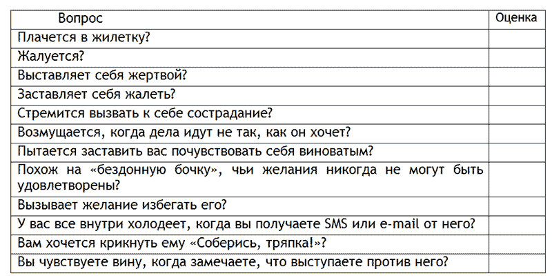 Патологически прилипчивые люди могут опустошить вас эмоционально и финансово. Всем своим существованием они говорят: «Ты мне нужен, чтобы решить все мои проблемы», «Я не могу без тебя ничего сделать», «Мое счастье целиком зависит от тебя», «Если ты оставишь меня, я погибну». В отличие от людей, которые просят о помощи, только когда они действительно в ней нуждаются, и всегда благодарят за нее, люди-прилипалы требуют помощи и внимания постоянно и непрерывно, используя эмоциональный шантаж, чтобы добиться своего, и высказывают благодарность только для того, чтобы вы не сорвались с крючка.