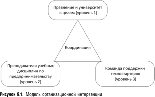 В результате формируются три уровня организационной интервенции (рис. 9.1), которые мы назовем «правление», «преподаватели предпринимательства» и «команда поддержки техностартеров».