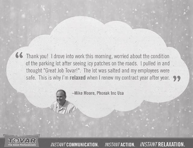 Рис. 7.1. Отзывы потребителей Tovar: «Спасибо! Сегодня утром я ехал на работу и переживал за состояние парковки, поскольку на дорогах было весьма скользко. Я подъехал к офису и подумал „Так держать, Tovar!“. Парковка была посыпана солью, мои сотрудники были в безопасности. Именно поэтому я не напрягаюсь, так как обновляю контракт с Tovar из года в год». Майк Мур, PhonakInc, США