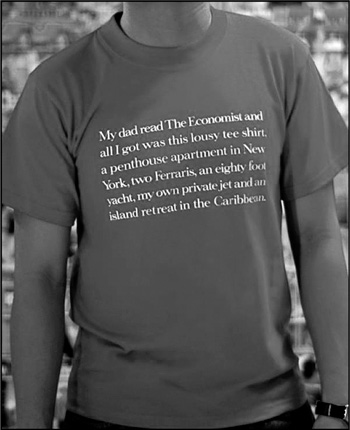 Жалоба на жизнь владельца майки (рис. 149) гласит: «Мой папа читал Economist, и все, что я получил, – вот эту растянутую футболку, пентхаус в Нью-Йорке, пару Ferrari, 24-метровую океанскую яхту, собственный самолет и виллу на Карибах».