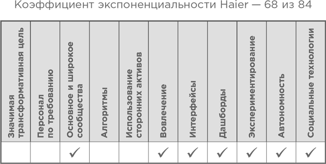 Доходы Haier за последние четырнадцать лет выросли в четыре раза. В 2013 году компания продала более 55 млн единиц бытовой техники и получила выручку в 29,5 млрд долларов. За период с 2011 по 2014 год рыночная капитализация Haier увеличилась в три раза – с 20 млрд до 60 млрд долларов, в основном благодаря ее приверженности экспериментированию и структуре на основе автономности. Неудивительно, что компания получила очень высокий балл по нашему тесту экспоненциальности.