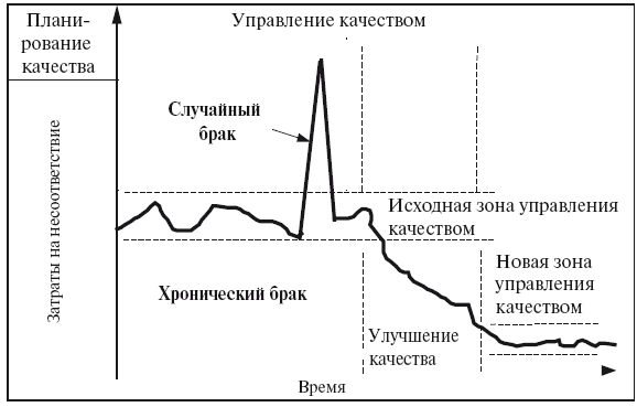 В противоположность этому хронические проблемы неизбежны в деятельности компании. Они могут оказывать значительно большее отрицательное влияние, чем последствия случайных ошибок, и при этом никому формально не поручено их решение. Джуран рассматривает хронические проблемы как результат допущений, сделанных в фазе, предшествующей процессу планирования. В данном периоде определенный уровень дефектности считался приемлемым, соответствующим состоянию технологии и практике управления. В последующих периодах совместное влияние развития техники и конкуренции делают данный уровень дефектности все более недопустимым.