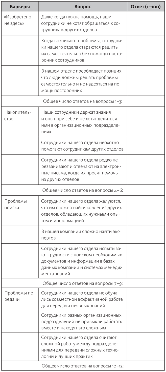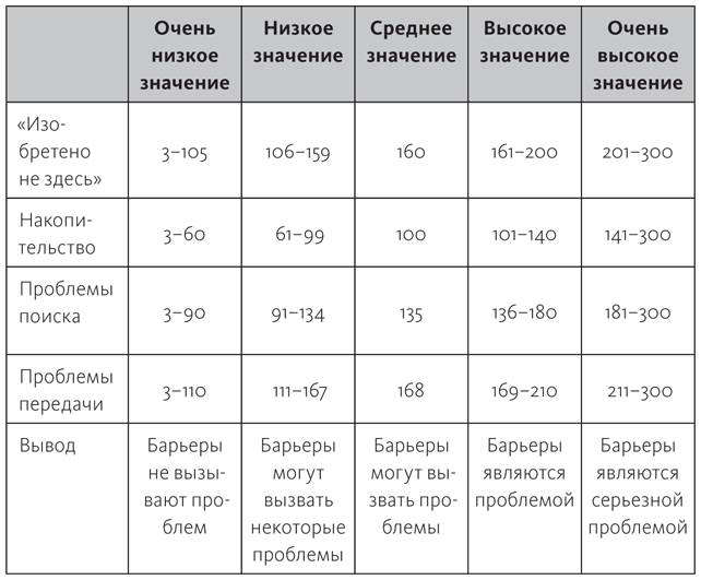 Поскольку все организации различаются, лидерам в первую очередь нужно определить совокупность барьеров, являющихся препятствиями. Какая комбинация действует в вашей организации или отделе? Ответив на вопросы, обозначенные в табл. 3.1, вы проведете быструю субъективную оценку. Затем сравните свой результат с результатами 107 компаний, уже выполнивших это задание.