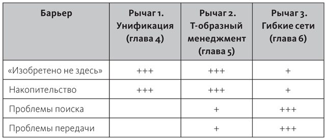Таблица «От проблемы к решению» является путеводной нитью трех следующих глав. Каждая глава описывает решение по устранению конкретного барьера. В главе 4 я размышляю, как лидеры могут объединить людей. В главе 5 я разбираю концепцию Т-образного менеджмента. Затем в главе 6 описано то, как сети снижают барьеры поиска и передачи.