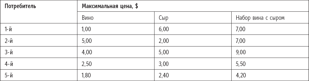 Какая цена отдельно за вино, сыр и за набор вина с сыром вместе принесет максимальную прибыль? Допустим, переменные расходы на единицу продукции равны нулю. Так мы упростим расчеты, не меняя основополагающей аргументации. Оптимальная цена только за сыр составляет $5. За эту цену его готовы купить потребители 1-й и 3-й, и прибыль (в данном случае она равна доходу) составит $10. Если продавец запросит $3 за сыр, три покупателя будут готовы заплатить, но прибыль составит только $9. Оптимальная цена за вино – $4, и потребители 2-й и 3-й покупают его за эту цену. Прибыль (она опять-таки равна доходу) составляет $8. Следовательно, если продавать вино и сыр по отдельности по этим оптимальным ценам, то общая прибыль составит $18.