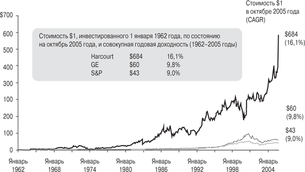 Примечание. NMG была отделена в октябре 1989 года, а Harcourt General продана Reed Elsevier в июле 2001 года. Для сохранения полученных доходов от продажи NMG компании TPG и Warburg Pincus в октябре 2005 года предполагается, что средства от продажи активов группе Reed Elsevier были реинвестированы в ценные бумаги, темпы роста стоимости которых соответствовали среднегодовому росту компании Leucadia и индекса S&P 500 (CAGR Leucadia и S&P – 17,7 и 0,7 % за период с июля 2001 года по октябрь 2005 года).