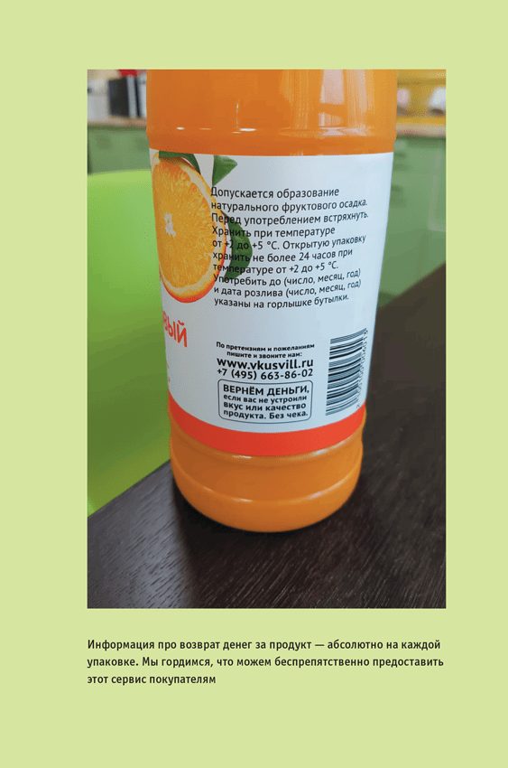 Но система управления «ВкусВилла» всегда ориентируется на большинство. В данном случае мы прекрасно понимаем, что для 99 процентов покупателей возврат продукта без чека – это оказанное доверие и важная страховка на случай невкусной покупки. А для нас – уверенность в качестве собственных товаров и один из мощнейших источников обратной связи, ведь все возвраты анализируют технологи из Управления контролем качества и в случае массовых проблем с тем или иным продуктом вся партия оперативно снимается с продажи.