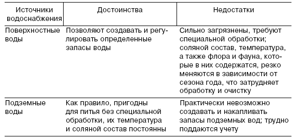 Для организации водоснабжения городов используют различные источники природной пресной воды. Эти источники в зависимости от используемых вод делятся на поверхностные (водохранилища, реки, озера) и подземные (артезианские скважины, трубчатые и шахтные колодцы и т. п.). Основные достоинства и недостатки поверхностных и подземных вод показаны в табл. 3.3.