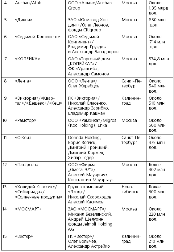 3. ЗАО «Торговый дом „Перекресток“» основано в Москве в 1995 г., управляет сетью супермаркетов и гипермаркетов (143 магазина в 14 регионах России на 30 июня 2006 г.). Доходы группы компаний «Перекресток» за 2005 г. выросли на 53,6 % – до 1,185 млрд дол., включая НДС, что соответствует 1,014 млрд дол. по международным стандартам финансовой отчетности.
