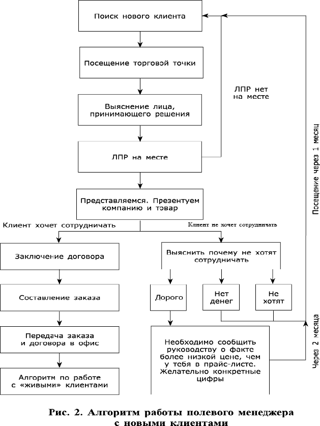 в) есть еще способ, эффективность которого достаточно низка, но заняться им можно. Необходимо прошерстить старую базу данных компании, а именно тех клиентов, которые по каким-то причинам перестали сотрудничать с компанией. Вероятных причин прекращения сотрудничества масса. Возможно, клиент плохо платит и компания сама сознательно отказалась от сотрудничества с ним, а может, твой предшественник просто перестал работать с клиентом (например, из-за его неудобного расположения или не очень большего оборота – в общем, в обоих случаях из-за банальной лени);