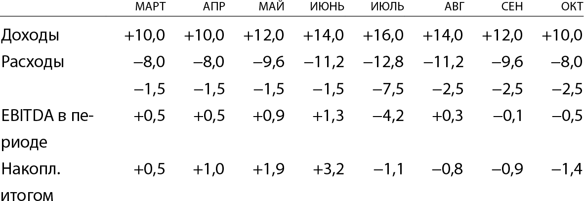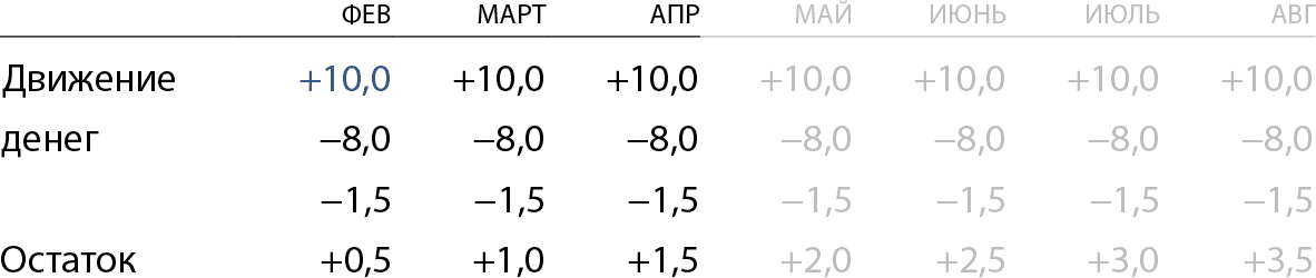 Каждый месяц он продает на 10 млн и платит 8 млн за прошлый месяц продаж. Расходы бизнеса — 1,5 млн. С мая — проекция на будущее