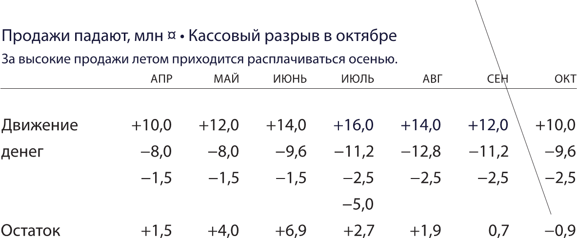 Но тут сезон кончился и продажи упали. И теперь математика играет против Сергея: в каждом следующем месяце ему нужно отдавать больше, чем в прошлом. А выручки в текущем месяце всё меньше. Через два месяца в таком темпе у него физически закончились деньги — случился кассовый разрыв.