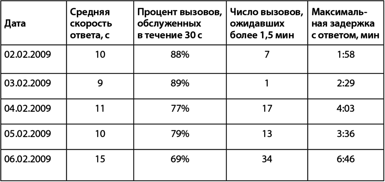 Если взять только один столбец, а именно – среднюю скорость ответа, то ее значения выглядят вполне удовлетворительно: 9–15 секунд – отличный показатель ASA. Если же взглянуть на следующий столбец – уровень обслуживания, то радужная картинка несколько померкнет. Если в понедельник, 2 февраля 2009 года, уровень обслуживания составил 88 %, то к пятнице, 6 февраля 2009 года, он упал до 69 %. Понятно, что стоит обратить внимание на причины, вызвавшие столь негативные изменения.
